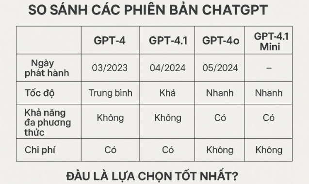 OpenAI đang không ngừng hoàn thiện và đa dạng hóa các phiên bản ChatGPT, phù hợp với mọi nhu cầu từ cơ bản tới chuyên sâu. Hiện tại, GPT-4o là lựa chọn toàn năng nhất cho đa số người dùng nhờ khả năng “all-in-one” cả text, code, hình ảnh và giọng nói, lại có tốc độ xử lý vượt trội. Tuy nhiên, với các ứng dụng yêu cầu tốc độ cực nhanh và chi phí thấp, GPT-4.1 mini cũng là lựa chọn không thể bỏ qua.